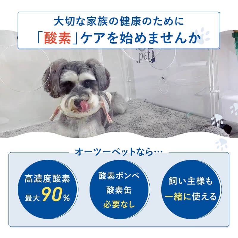 A. 基本的に安全です。獣医療でも酸素療法は一般的に使われています。ただし持病や状態によって最適な濃度や時間が異なるため、心配な場合はかかりつけ獣医師と相談しながら導入すると安心です。